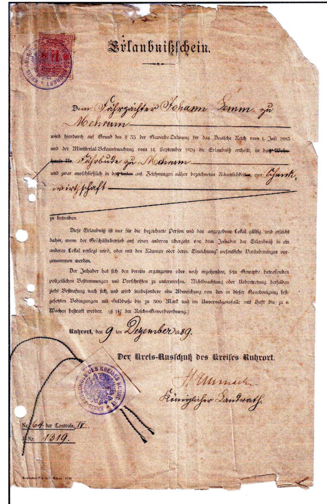 1889 Konzession an den Schiffer Johann Lemm ( siehe Erlaubnisschein folgend)