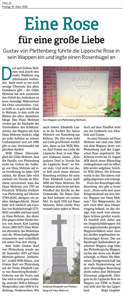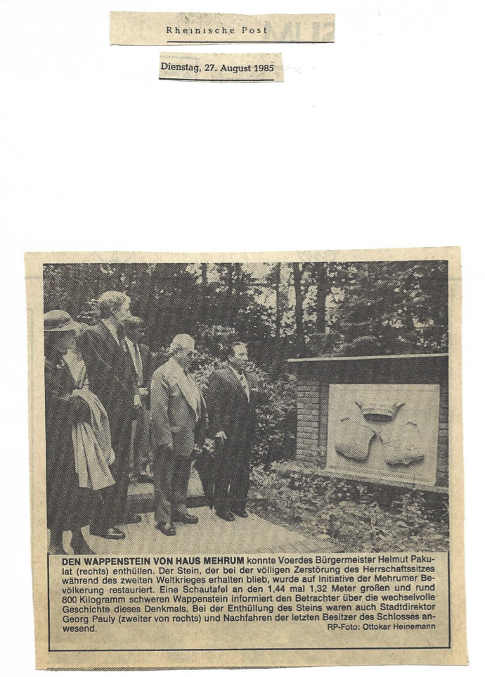 Durch die Mehrumer Dorfgemeinschaft wurde der Wappenstein am Ehrenmahl im ehemaligen Schlosspark eingeweiht. Unter großer Beteiligung der Mehrumer Bevölkerung, Spitzen der Politik und Nachfahren des letzten Schlossherren fand diese Feierstunde statt.